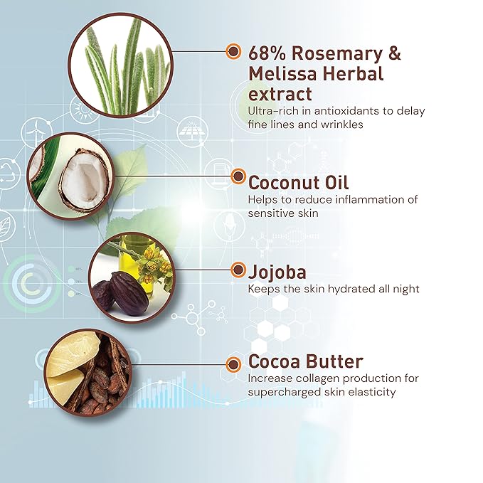 - PREMIUM HERBAL MOISTURIZER FOR DRY SKIN — Moraz Night Face Cream is enriched with a potent blend of natural ingredients: 68% concentration of Rosemary Leaf Extract, Coconut Oil, Jojoba Oil, and Cocoa Seed Butter that provide deep hydration and effective skin firming and tightening cream that works overnight to rejuvenate your skin as you sleep