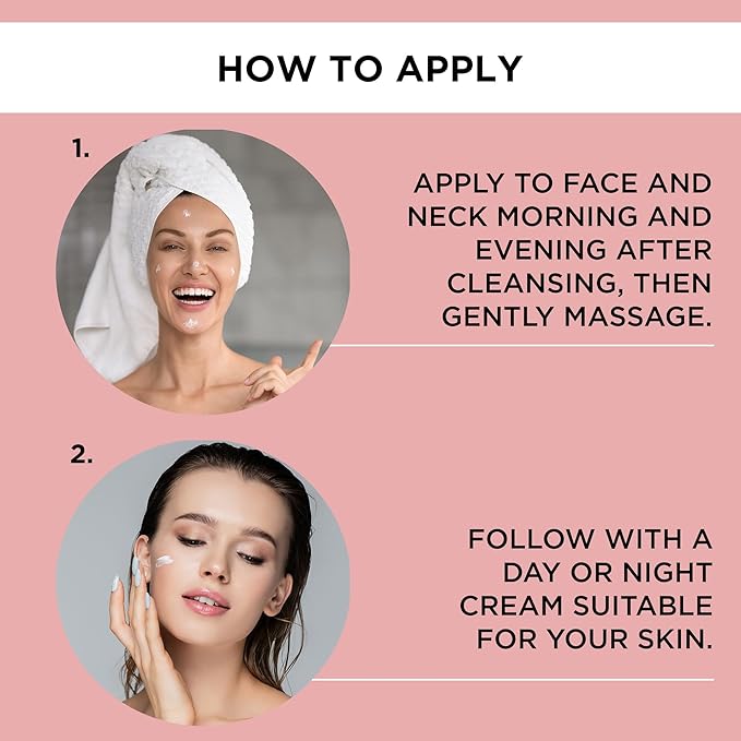 - APPLICATION: Apply to the face and neck mornings and evenings after cleansing and gently massage it in. Then apply a day or night cream suitable for your skin.
