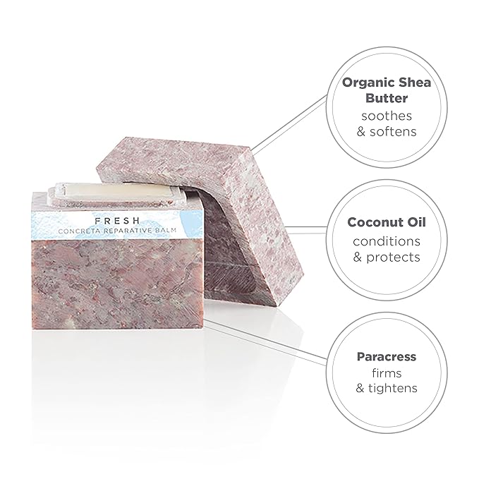 - RESTORING SKIN SALVE. This deep-conditioning balm is packaged in an artisan-carved stone and transforms dry skin. Great for gifting or a beautiful piece on your vanity or nightstand, Concreta is ideal for the neck, elbows, cuticles, heels, knees and feet.