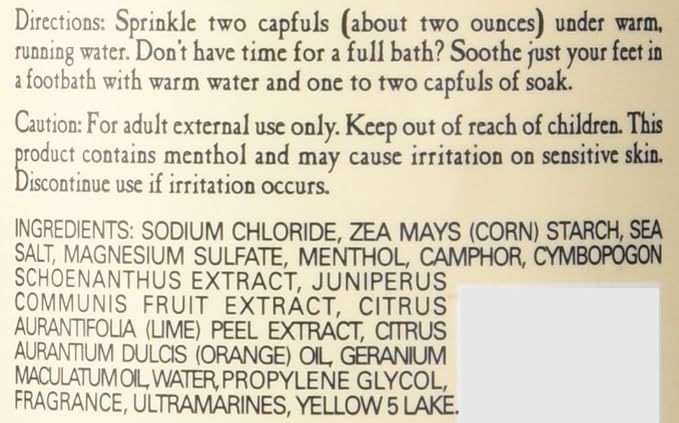 - EASY TO USE: Finding relief for your tired, strained muscles has never been easier! Simply sprinkle two capfuls (about two ounces) under warm running water for a soothing soak. Don’t have time for a full bath? Soothe your tired feet in a footbath with warm water and one to two capfuls of soak.