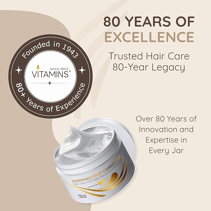 VITAMINS hair cosmetics Keratin Hair Mask Deep Conditioner - Biotin Collagen Protein & Castor Oil Repair for Dry Damaged Hair - Conditioning Treatment for Curly or Straight Thin Fine Locks