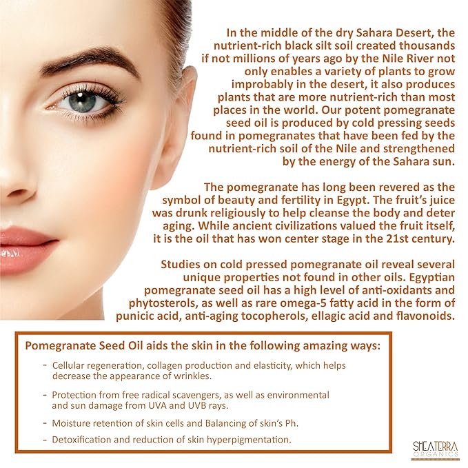 - Powerful Nutrients: Egyptian Pomegranate Extra Virgin Oil has a high level of fatty acids omega-5, tocopherols, ellagic acid & flavonoids that reverses skin damage and protects it from UVA & UVB damage.
