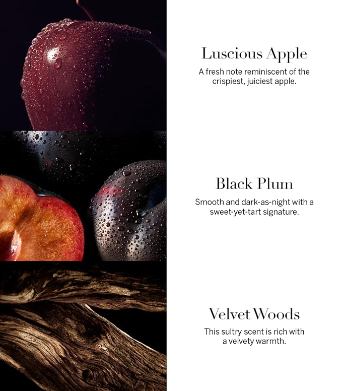 - Scent notes of black plum, velvet woods, and luscious apple.