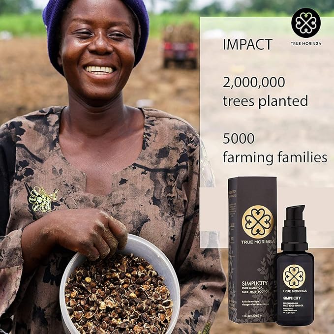 - 100% NATURAL, PLANT BASED, VEGAN & SUSTAINABLE: Our 100% pure cold-pressed moringa oil is vegan, paraben-free, and sulfate free. True Moringa works directly with a network of 2900 small farming families, planting one million moringa trees to combat deforestation and malnutrition locally in Ghana & creating the largest certified organic moringa farm in Ghana.