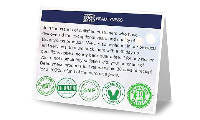 - We are so confident in our products and services, that we back them with a 30 day no questions asked money back guarantee. If for any reason you're not completely satisfied with your purchases of beautyness products just return within 30 days of receipt for a 100% refund of the purchase price. OUR STOCK OFTEN SELLS OUT FAST !! BE QUICK AND ORDER YOURS NOW.