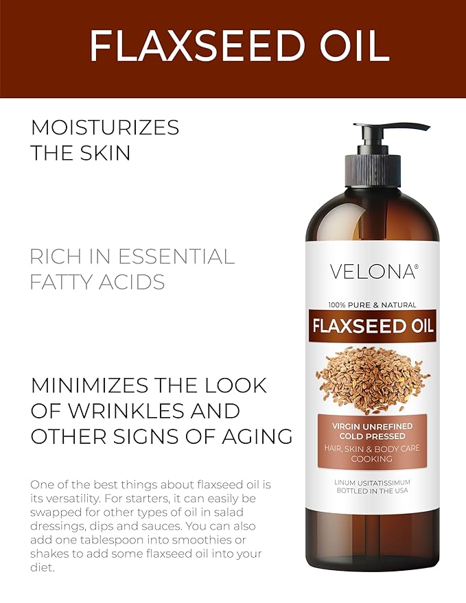 - Velona Flaxseed Oil: 100% Pure and Natural Carrier Oil. Unrefined. Cold Pressed. Not Diluted, Non-GMO, No Additives, No Fragrance, Chemical Free, Alcohol Free.