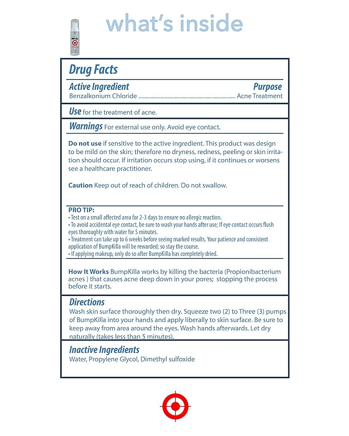 - BumpKilla Challenge - Get rid of 80% of your acne in 4 - 6 weeks or it's Free! The primary ingredient in BumpKilla is BenzalKonium Chloride. This ingredient has been approved for skin and food contact. It can be found in numerous products including mouthwashes, hand sanitizers and on condoms as a spermicide. In Bumpkilla it serves as the chief aid to stop the formation of acne. It is both safe and effective. WARNING: Only purchase this if you have the Foamer version at home [B075NVRMY2].