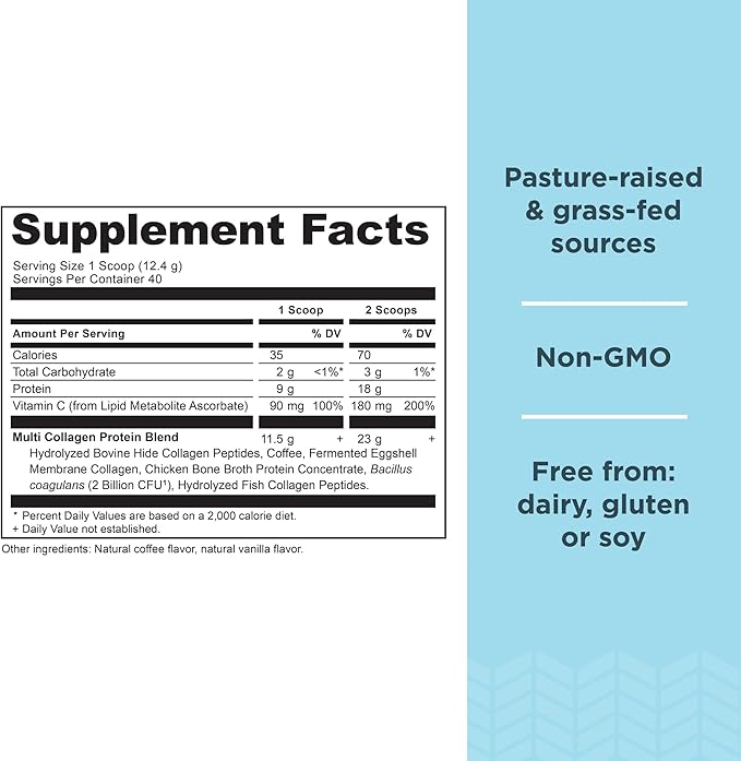 - EASY TO USE AND PACKED WITH NUTRIENTS: Multi Collagen Protein Cold Brew offers an energizing coffee flavored drink with 9g of protein, 42 mg of caffeine (per serving) and 40 calories in every serving. Add a scoop to any smoothie, protein shake, tea, coffee or your favorite drink for a daily boost of collagen protein and gut support..
