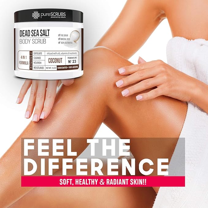 - GET ULTRA SMOOTH SKIN FAST - THIS WORKS! Our unique “4 in 1 Formula” does everything a body scrub should do and more - EXFOLIATE, CLEANSE, NOURISH & MOISTURIZE. Fine grain dead sea salt infused with essential oils, nutrients and skin softeners helps to smooth away rough, bumpy, and uneven textures to instantly reveal your true soft, healthy and radiant skin. You'll love the coconut aroma!
