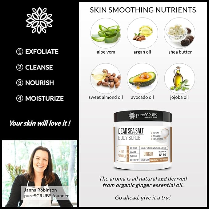 - GET ULTRA SMOOTH SKIN FAST - THIS WORKS! Our unique “4 in 1 Formula” does everything a body scrub should do and more - EXFOLIATE, CLEANSE, NOURISH & MOISTURIZE. Fine grain dead sea salt infused with essential oils, nutrients and skin softeners helps to smooth away rough, bumpy, and uneven textures to instantly reveal your true soft, healthy and radiant skin. You'll love the vanilla aroma!