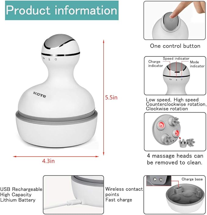 Electric Scalp Head Massager, IPX7 Waterproof Rechargeable Head Massager for Stimulating Hair Growth, Deep Clean, Blood Circulation and Stress Release