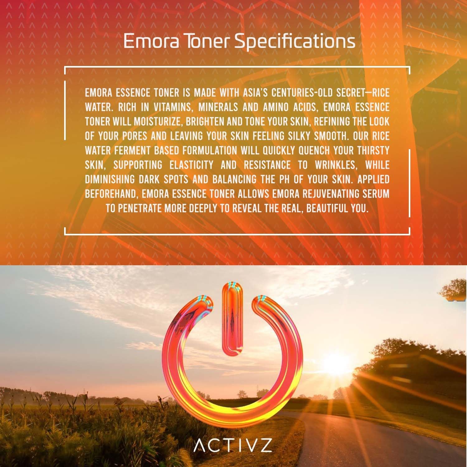 - Enhances Product Absorption: Activz EMORA Essence Toner serves as a great prepping step in your skincare routine, enhancing the absorption of follow-on products and nutrients ensuring maximum efficacy.