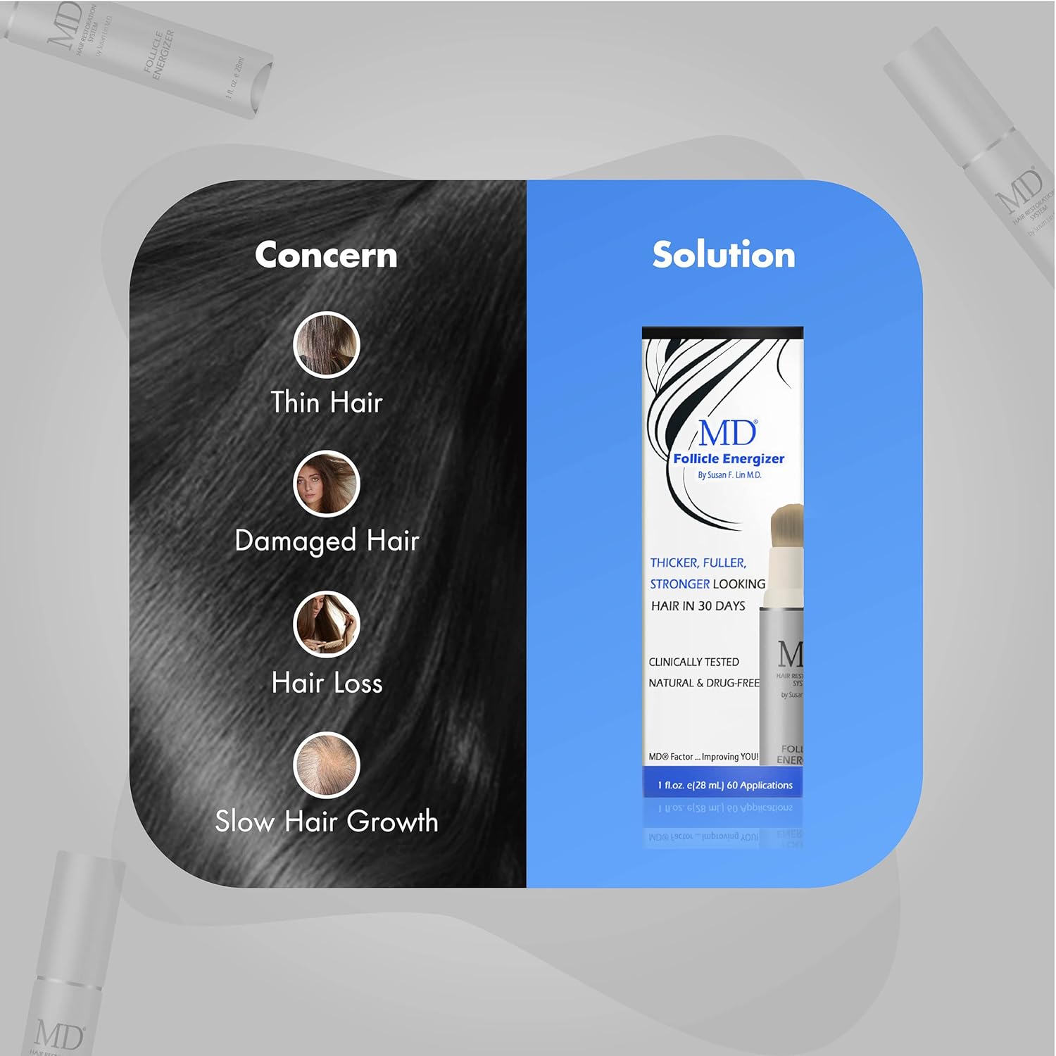 - Helps with hair loss: The hair restoration follicle energizer from MD is your one-stop solution for issues like hair loss, thinning, and accelerated baldness. The hair growth serum improves the appearance of thinning hair and shows results in as little as four weeks.