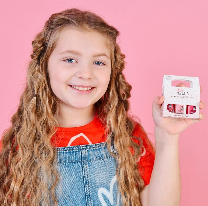 - GREAT SHADES: All kids are drawn to bright and happy colours, which is why Miss Nella’s nail polishes comes in a great range of shades with fun names that you can never forget: Sugar hugs (glittery see through pink), Cheeky Bunny (light shimmery pink) & Tickle me (dark shimmery pink)