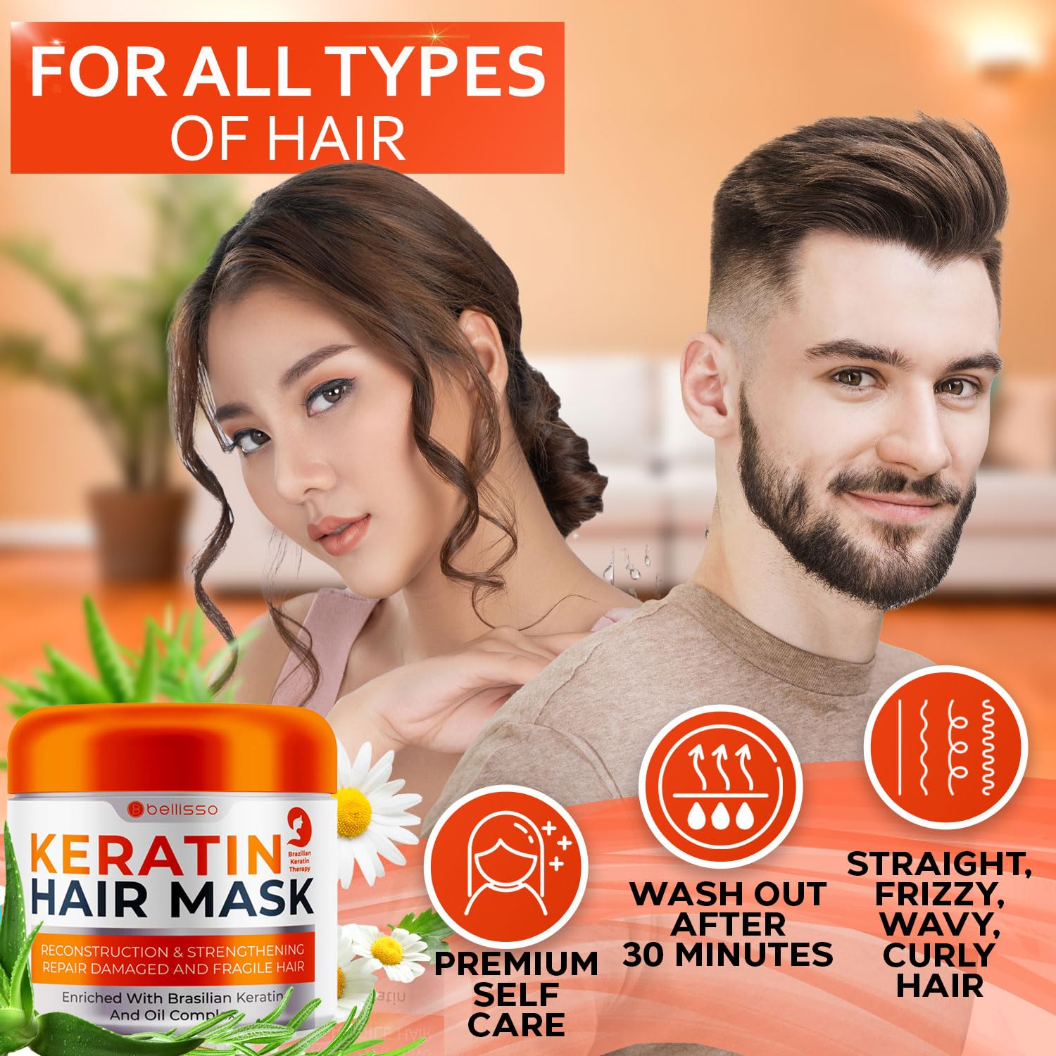 - ALL HAIR TYPES: More than just a hair mask for frizzy hair, Bellisso’s keratin hair moisturizer is suited for all types. Ideal as a hair mask for curly hair as well as for people with straight locks, this deep conditioning hair mask is suited for both men as well as women who want to look their best.