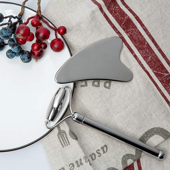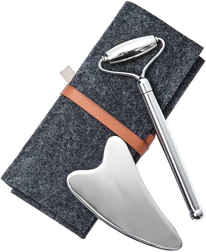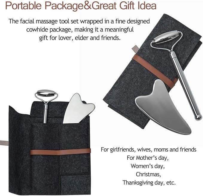 - 💗 Sturdy&safe stainless steel material: Made of premium top quality stainless steel material, the facial massage tools set is perfect for doing facial SPA. The material itself says for durability and easy cleanup. The smooth edges and curves of the roller and scraper ensure gently touching your skin without hurting while massaging your face accurately