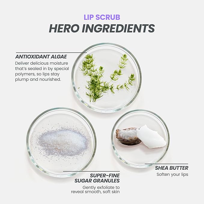 - 𝗠𝗢𝗜𝗦𝗧𝗨𝗥𝗜𝗭𝗘𝗦 𝗟𝗜𝗞𝗘 𝗔 𝗗𝗥𝗘𝗔𝗠 - The lip scrub's nourishing formula includes Shea Butter and algae, which provide excellent moisturizing properties, making it an excellent lip scrub for dry cracked lips. This lip scrubs exfoliator & moisturizer is designed to provide your lips with the right balance of nutrients, ensuring that your lips are always soft and hydrated.