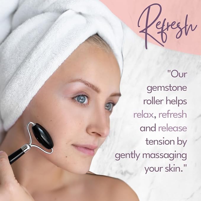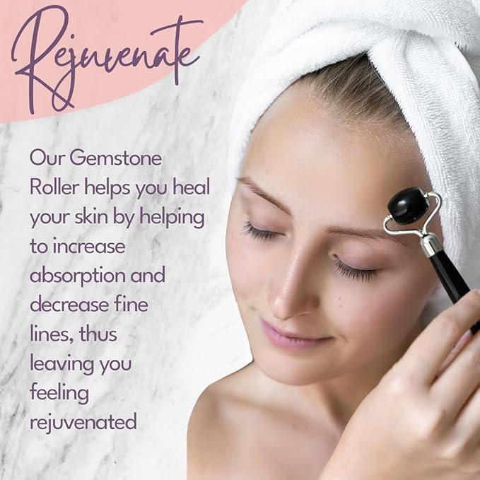- Rejuvenating Black Obsidian Roller – This spa face roller utilizes all-natural black obsidian gemstones that gently glide over your skin under the eyes, along the jawline, and across the cheeks or forehead to improve restore soft, healthy, radiant skin.
