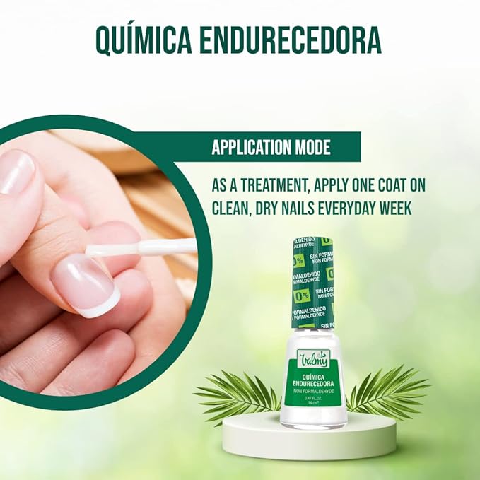 - 🌟 FORMALDEHYDE-FREE HARDENER: Our Valmy Química Endurecedora is specially formulated with a formaldehyde-free treatment that provides a protective barrier to your nails. This barrier strengthens and transforms your nails, improving their condition and protecting them from external aggressors that can cause damage.🌟