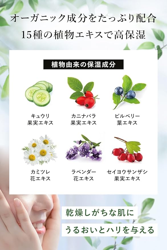 - Natural derived ingredients that gently moisturize your skin: Kamilei flower extract, hinoceros leaf / stem extract, cucumber fruit extract, cannabara fruit extract, betaine, wheat seed extract, sodium hyaluronic acid, glucocyltrehalose, hydrolyzed hydrated starch, bilberry leaf extract, lavender flower extract, salmon fruit extract. Cha Leaf Extract, Pu Melee fruit extract