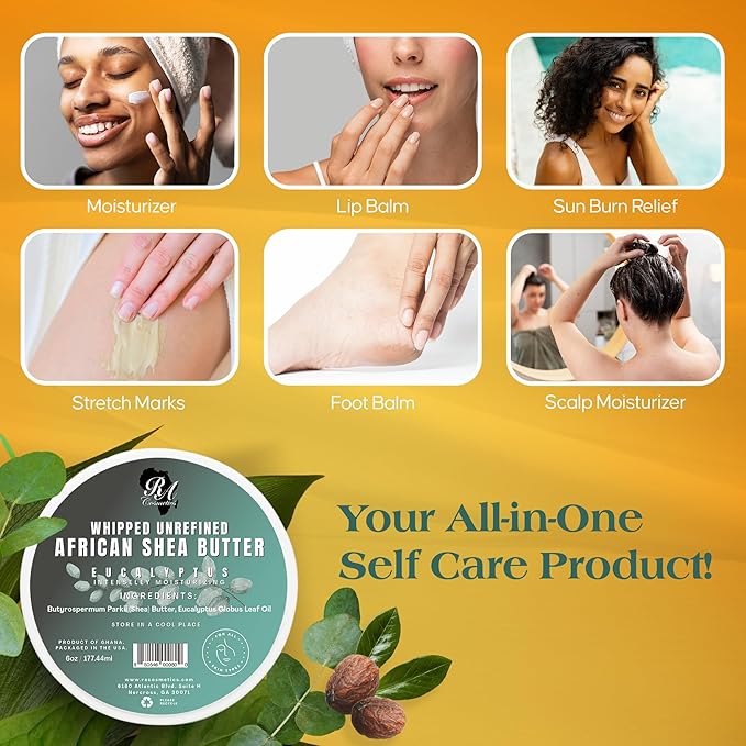- Premium Whipped Shea Body Butter: Enjoy the luxurious feel of African Shea Butter, expertly handcrafted in Ghana, West Africa. Our eucalyptus infused whipped shea butter, enriched with vitamin E and F, creates a protective moisture barrier, pampering your skin from head to toe for an ultimate moisturizing experience.
