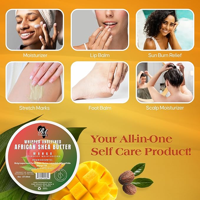 - Luxurious Mango Infusion: Indulge in the rich and exotic scent of mango with RA Cosmetic's Whipped Shea Butter. The infusion of mango adds a delightful fragrance, enhancing the overall skincare and haircare experience.