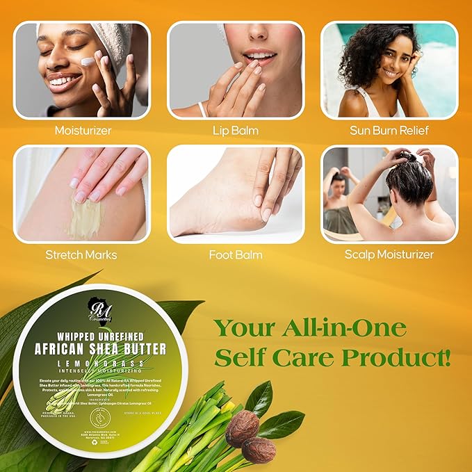- Premium Whipped Shea Butter: Enjoy the luxurious feel of RA Cosmetic's 100% African Shea Butter, expertly handcrafted in Ghana, West Africa. This whipped Lemongrass-infused shea butter provides an ultimate skin moisturizing experience, leaving you feeling pampered from head to toe.