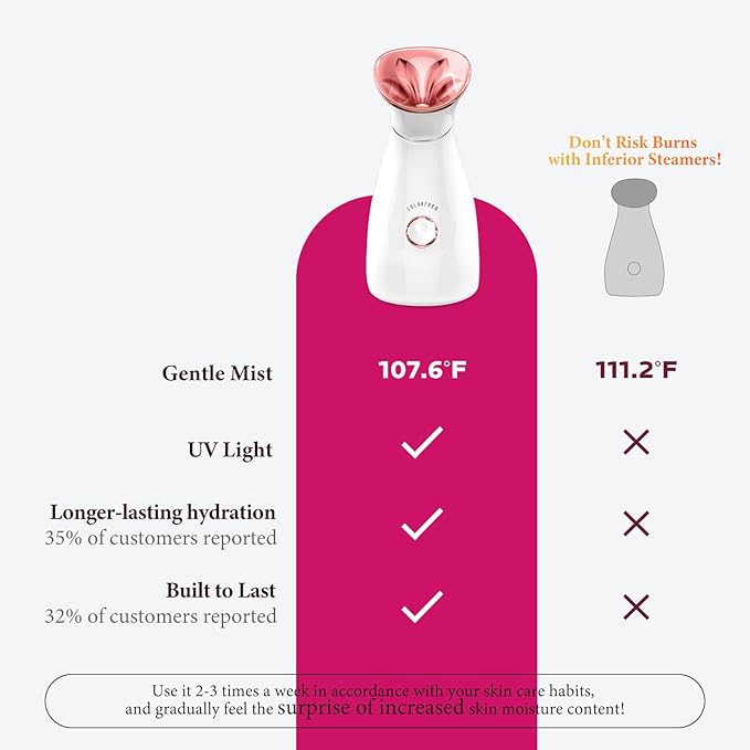 - High Evaluation: In order to ensure safe use, our facial steamer have been tested to applicable standards and obtain UL certification. It has nice appearance and petal-like nozzle, and each steamer comes with a 4-pcs stainless steel skin kits. With attractive packaged, it makes a great gift for girlfriends, wife, mothers and other loved ones