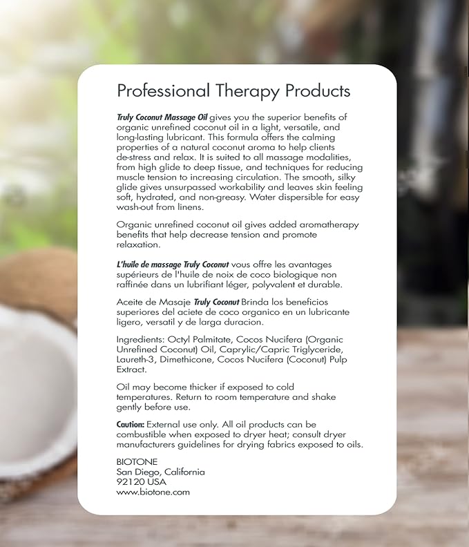 BIOTONE Truly Coconut Massage Oil with Organic Coconut Oil, Melts Away Tension and Promotes Deep Relaxation, Light, Versatile, Long-Lasting, Easy Wash-Out, Can Also Use as a Bodycare Oil