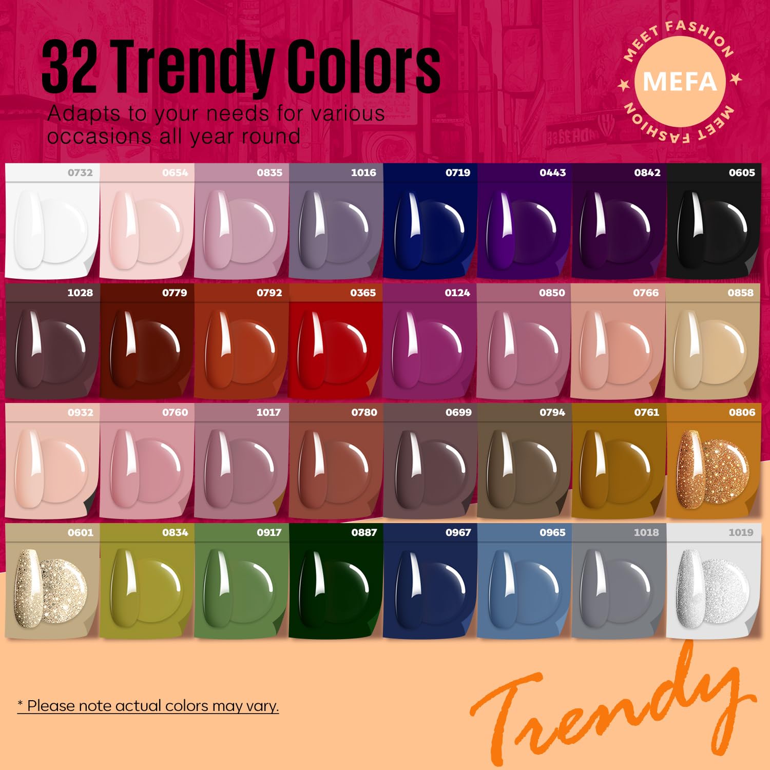 - 32 Colors Gel Polish: MEFA’s fall-winter set features 32 shades (7 ml each), including deep red, burgundy, purple, and champagne gold; perfect for autumn and winter, these trend colors offer looks from cozy purple to elegant nude