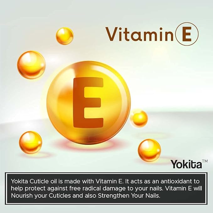 - Yokita Cuticle oil is made with Vitamin E. It acts as an antioxidant to help protect against free radical damage to your nails. Vitamin E will Nourish your Cuticles and also Strengthen Your Nails.