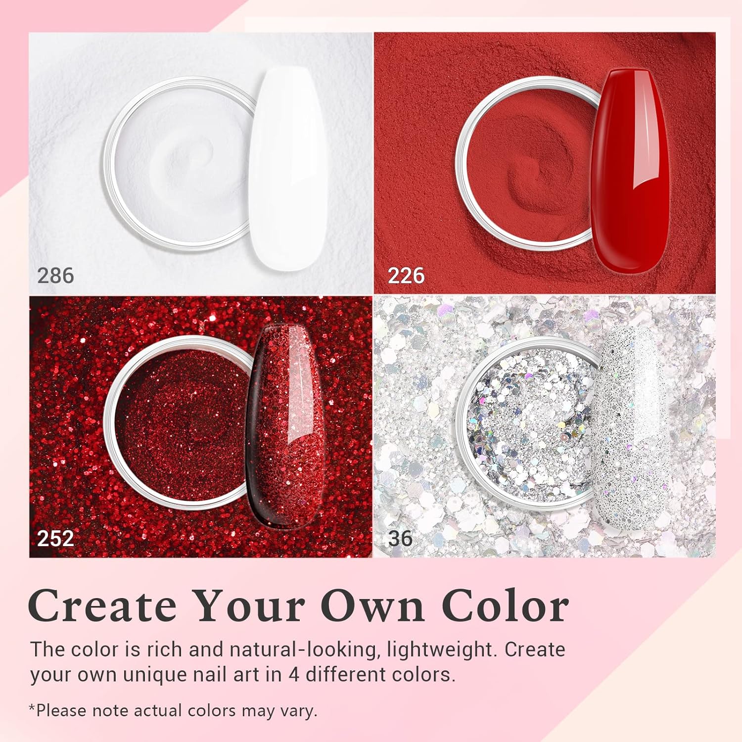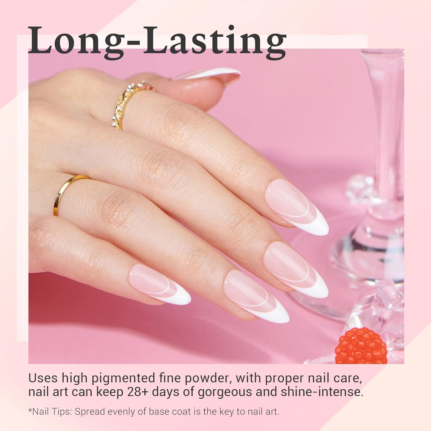 - Attention: ① Avoid direct contact with skin, remove immediately if you feel any discomfort. ②The effection of dip powder may show differently in different people, 2~3 base coats while using will be the best