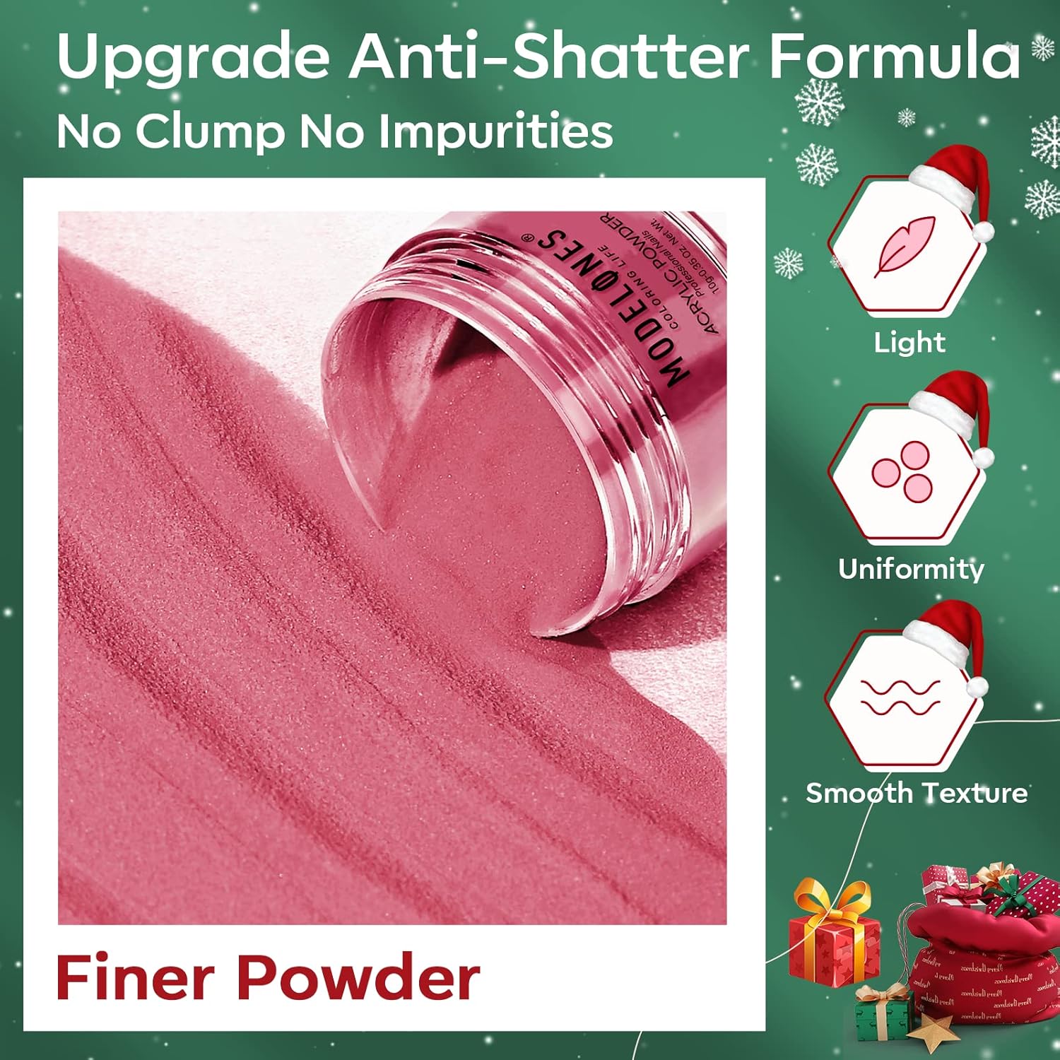 - 【Christmas Acrylic Powder】The acrylic nail powder includes 6 shades of solid and glitter powder to choose from, focusing on dark green & red tones, such as red , and dark red. The combination of different colors can let your imagination run wild and help you create your own Christmas acrylic nail looks.