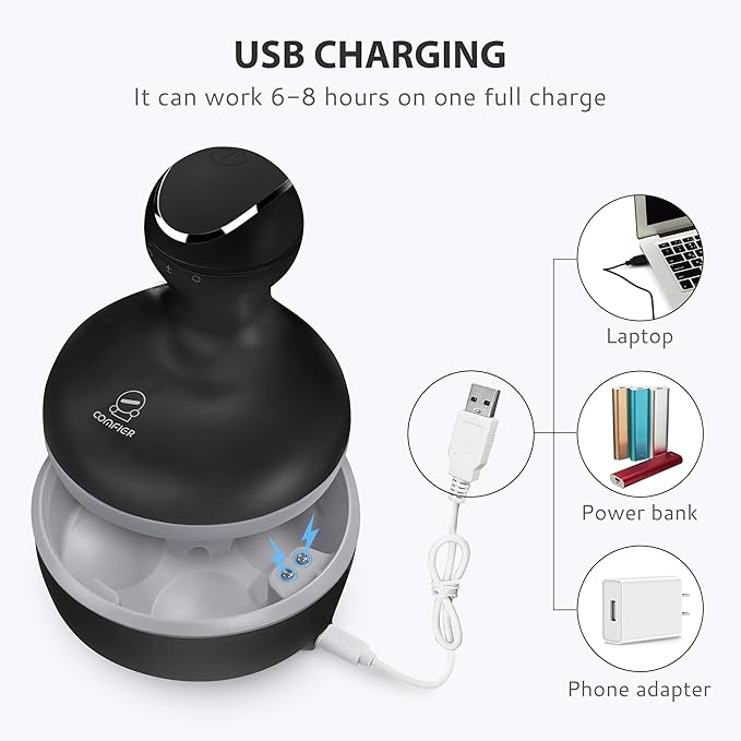 - Cordless & Rechargeable: The electric head massager is powered by rechargeable lithium-ion battery, so no need to plug in while in use. The head scratcher comes with a charging base and a USB charging cable and it lasts for a couple of hours on one full charge. Its compact, cordless portable design allows you to relieve tension from your office, home or even your car.