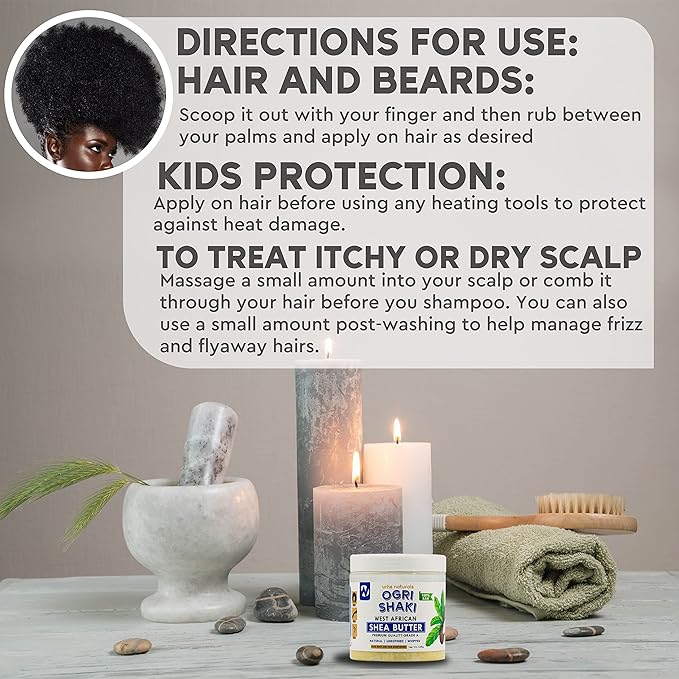 - AFTER SHAVE FOR WOMEN AND MEN: Africans over the years have used Ogri Shaki shea butter as an aftershave due to its fast-absorbing nature into scalps and skin. This makes it the best among body butters and moisturizers due to its smooth moisture. It contains vitamins A and E, which add moisture and shine to the hair and are not hair inhibitors. It can also be used during shaving for easy consistency.