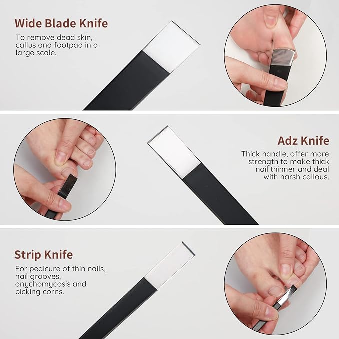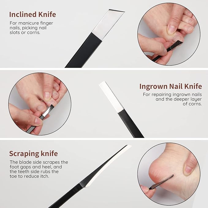 - 【Muti-Functional Set】9 kinds of various blades help to solve different pedicure treat-ment with ease. Product list: 1*Piece knife, 1*flat knife, 1*oblique knife, 1*adze knife, 1*strip knife, 1*scraper, 1*chick nose pliers, 1*nail kicker, 1*double-sided nail file, 1*PU storage bag.