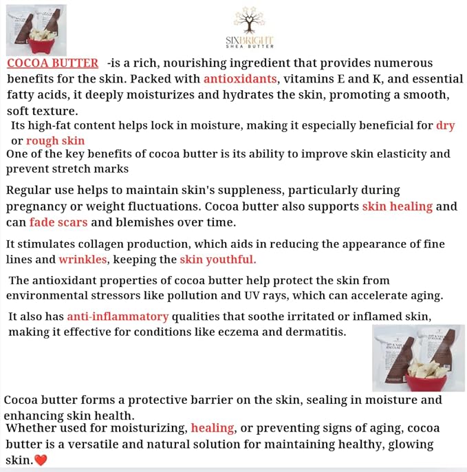 Sixbright UNREFINED, 100% PURE, FOOD GRADE, NATURAL COCOA BUTTER- Repairs Body Scars, Stretch Marks, Dry & Cracked Skin- Great for DIY's Beauty products-16 Ounce -(Pack of 1)- Chocolate Aroma