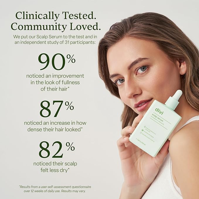 - AWARD-WINNING, CLINICALLY TESTED FORMULA – Divi’s Scalp Serum is designed to nourish your scalp and promote a fuller, healthier-looking head of hair. In a 12-week study, 90% of participants saw improvement in hair fullness, and 87% noticed increased hair density.
