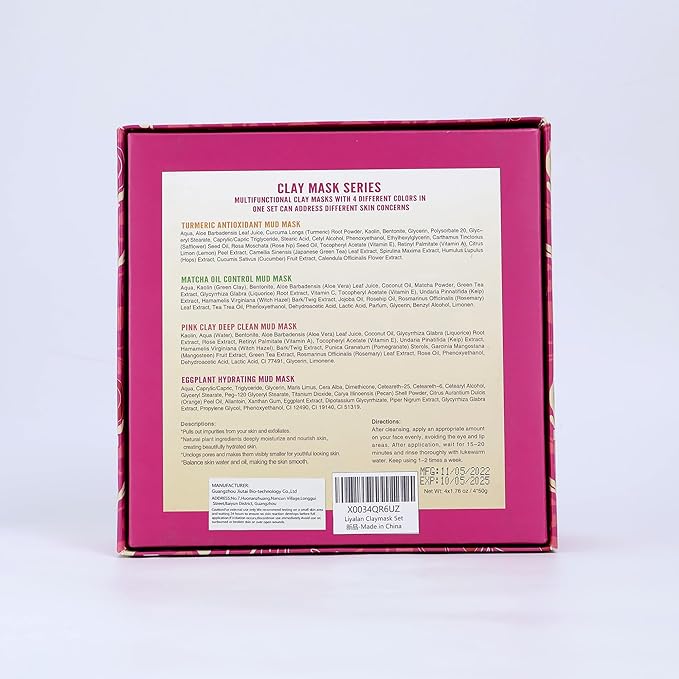 - The box contains 4 quite popular clay masks of LIYALAN,with matcha clay mask 50g,Pink Clay Mud Mask 50g, Eggplant mud mask 50g,Turmeric clay mask 50g,solving various kinds of skin problems at one set.One mask brush and a hair band are giveaway for your convenience