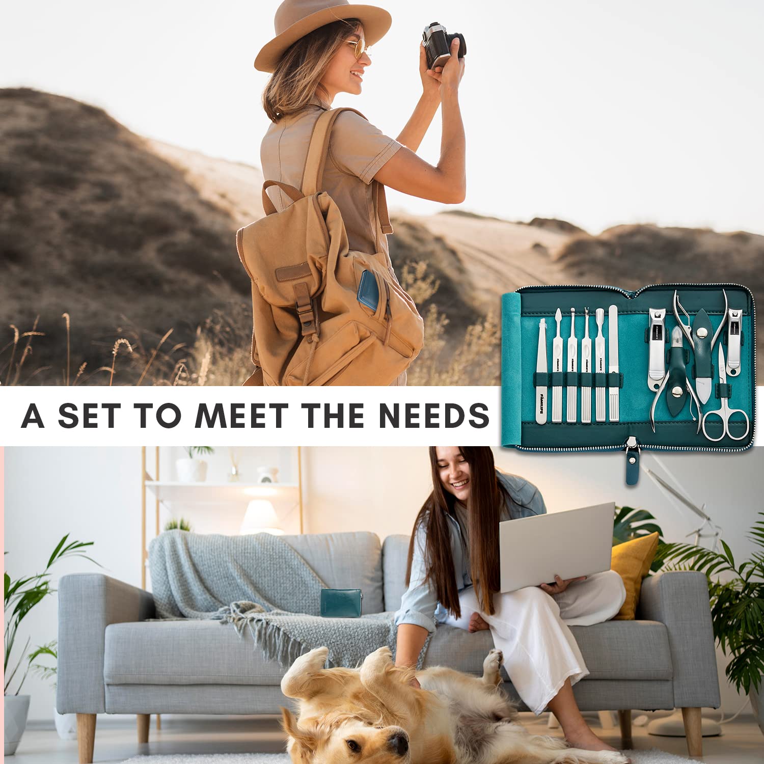 - 【Mani Pedi Kit with Luxury Fashion Case】 Our Stainless Steel Manicure Kit with a blue gorgeous leather case makes it a fashionable and popular gift for your relatives, friends, parents, and the husband. Lightweight and portable travel essentials can offer exceptional foot, hand, and facial grooming tools
