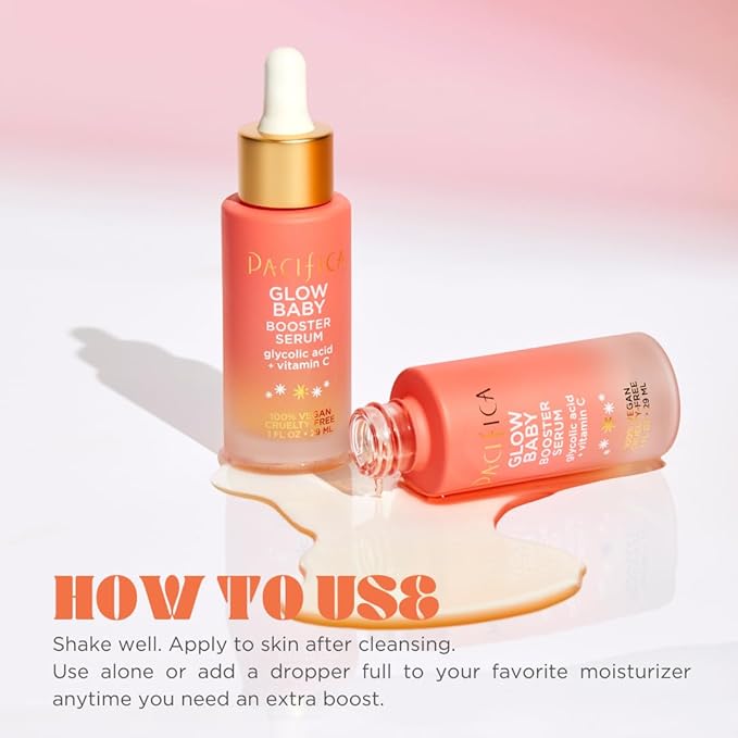 - PACIFICA'S BEST SELLING GLOW BABY SKINCARE COLLECTION featuring a mini Brightening Face Wash cleanser, mini Glow Baby Booster Serum + one full-size Eye Bright Undereye Mask, this set of glow-bestowing formulas are deliciously orange-scented and infused with vitamin C, and glycolic acid to cleanse and treat dull skin