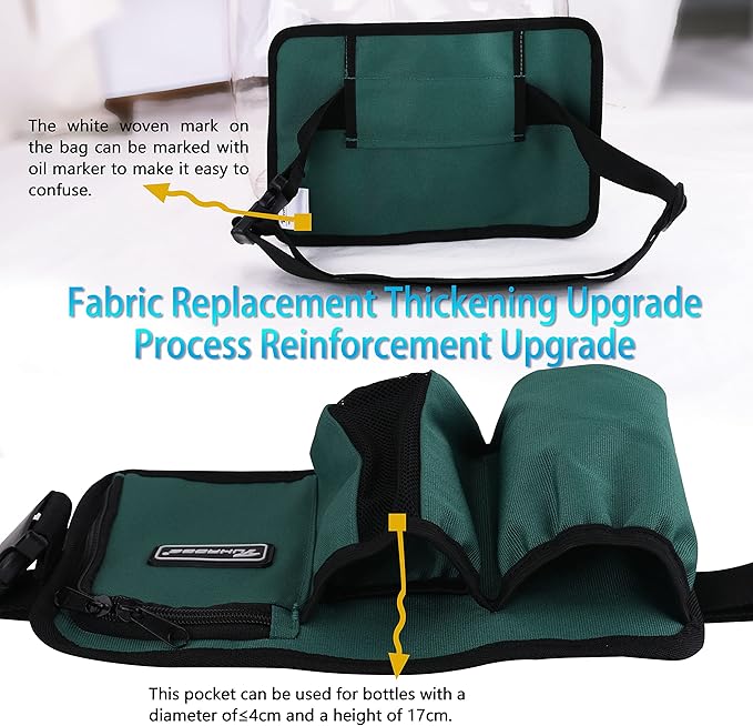 - 4、There are two big pockets and one small pocket in front which can be temporarily replaced with bottles of different capacities. The two big pockets can be used with bottles of diameter ≤2.36inch and height 9.45inch. One of them is made into a pocket in the form of mesh cloth, which is convenient to watch the capacity of the bottle; In addition, a small pocket can be used for a bottle with a diameter ≤1.57inch and a height of 6.69inch;