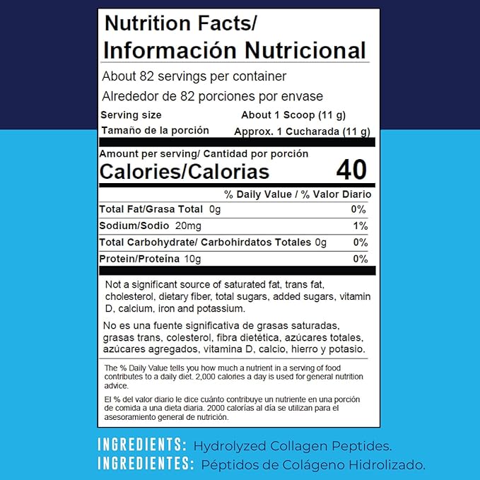 - PÉPTIDOS DE COLÁGENO HIDROLIZADOS - ALIMENTADOS CON PASTO: 82 porciones de péptidos de colágeno de primera calidad. Cada cucharada contiene 11 g de péptidos de colágeno (10 g de proteína) que contienen colágeno tipo I y III. Es ideal para ayudar a las articulaciones, los huesos, el cabello, el sistema digestivo, las uñas y la piel.