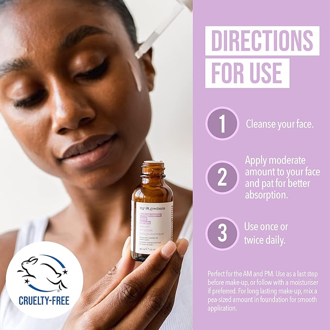 - The Polyglutamic Acid Serum has a serious skin-replenishing formula designed to help fight the signs of aging while leaving your skin hydrated and plump. Polyglutamic Acid is a more powerful humectant than it's more well-known cousin, Hyaluronic Acid. The extra water-attracting properties help increase cellular volume and give skin a plump, dewy glow.