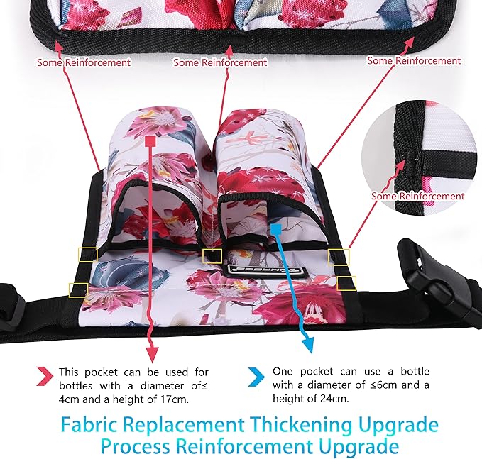 - 3.Design: * The design of the bag has a total of 5 pockets, the front design has two large pockets and two small pockets can be used for different capacity bottle, the large pocket can be used for the diameter ≤2.36inch 9.45inch bottle; In addition, the two small pockets can be used for bottles with diameter ≤1.57inch and height of 6.69inch;