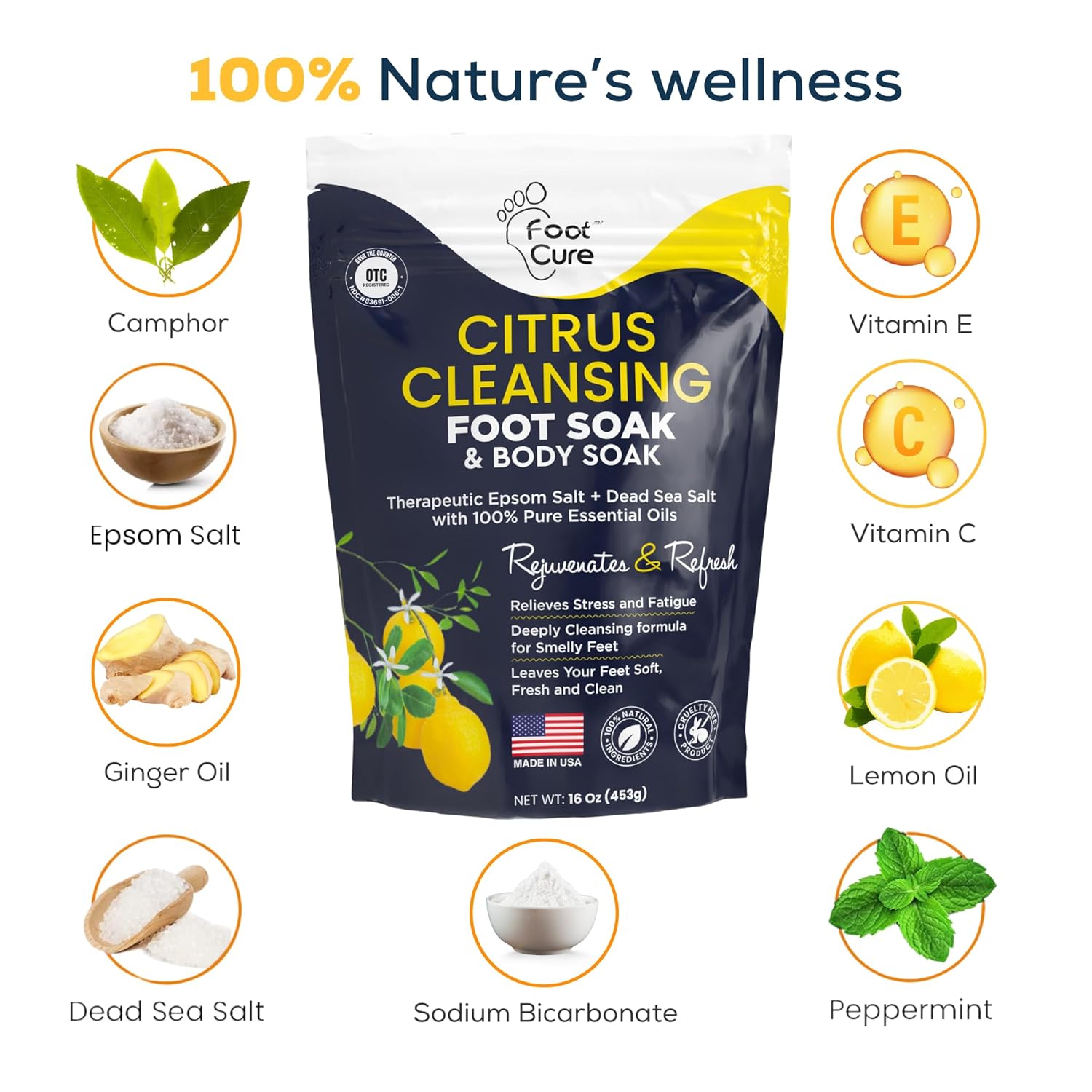 - FOR SOOTHED, MOISTURIZED, DEEP CLEANSED FEET: This moisturizing Cleansing Soak with Epsom Salts and Dead Sea Salts will instantly rejuvenate your tired, limbs for healthier, well-rested, pain-free feet from the very first use. Plus, the deep cleaning action of Citrus helps eliminate foot odor, Athlete’s Foot, calluses, and dead skin.