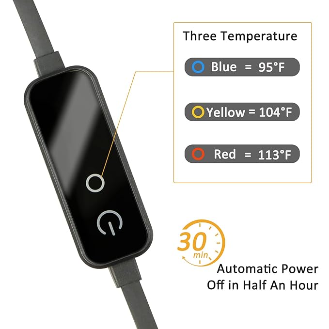 - Three levels of the temperature: The temperature lights will appear on the controller once you turn it on. Green light for Low temperature (95℉), Blue light for medium temperature (104℉), and Red light for High temperature (113℉). Also, our heated eye mask has a protection system that will automatically turn off after half an hour.