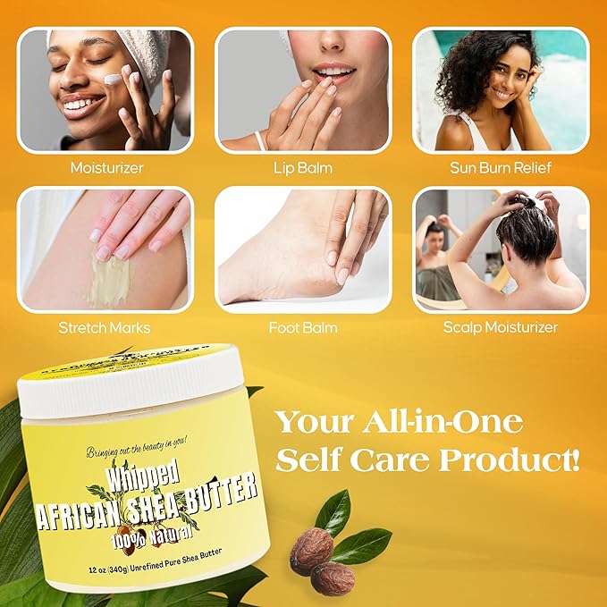 - Premium Whipped Shea Body Butter: Enjoy the luxurious feel of African Shea Butter, expertly handcrafted in Ghana, West Africa. Our whipped shea butter, enriched with vitamin E and F, creates a protective moisture barrier, pampering your skin from head to toe for an ultimate moisturizing experience.