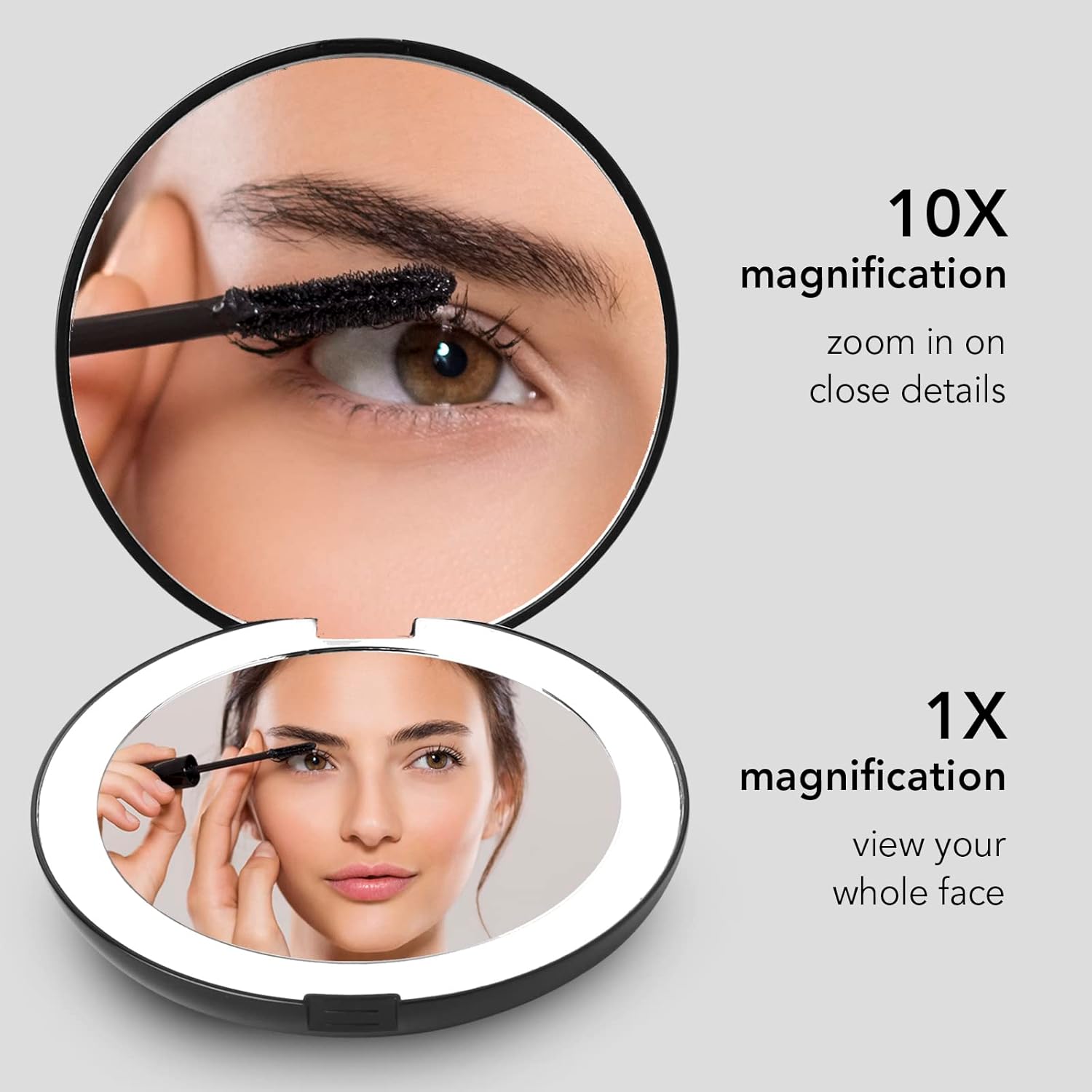 - Fancii Led Lighted Travel Makeup Mirror, Rechargeable With 10x/1x Magnifying & 3 Light Settings - Compact, Portable, Large 5” Wide Hand Mirror for Handbag and Purses (Black)