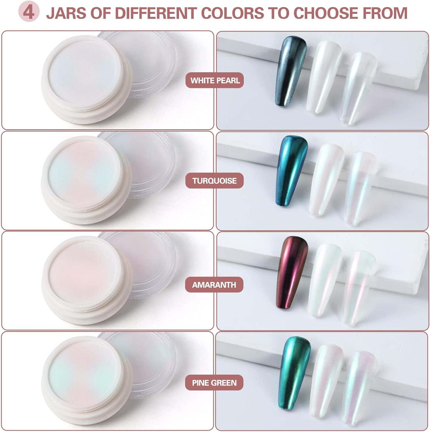 - PACKAGE CONTENTS:4pcs(each 1gram) white based chrome nail mirror pigment powders. It needs to be used with gel nail polish and no wipe top coat